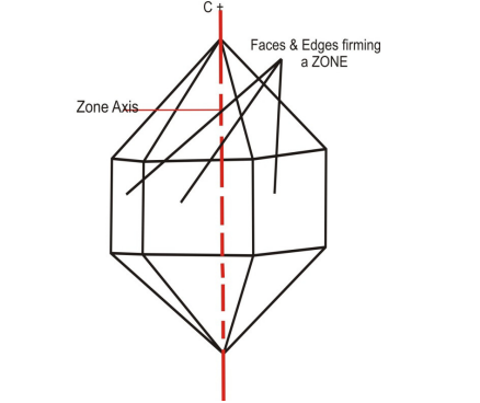 4. Zone and Zone Axis: The study of crystals shows that in many cases, the faces are arranged so that the edges formed by their intersections run parallel to each other. Each group of such parallel edges corresponds to a specific set of faces. A zone is defined as a group of faces whose intersections produce these parallel edges. An imaginary line inside the crystal, parallel to all the edges in a zone, is called the zone axis.